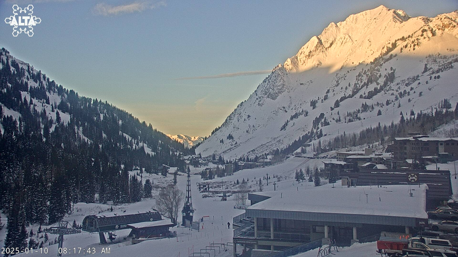 We're seeing a bit of a temperature inversion this morning with summit and valley temps between 25-30°F and mid-elevation temps closer to 20°F. Also, the sun and clouds are having a spirited spar on who gets to control the sky; here's what that looks like from Brighton: